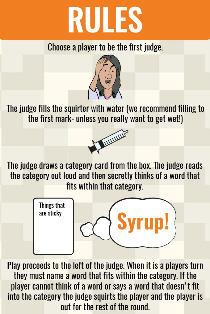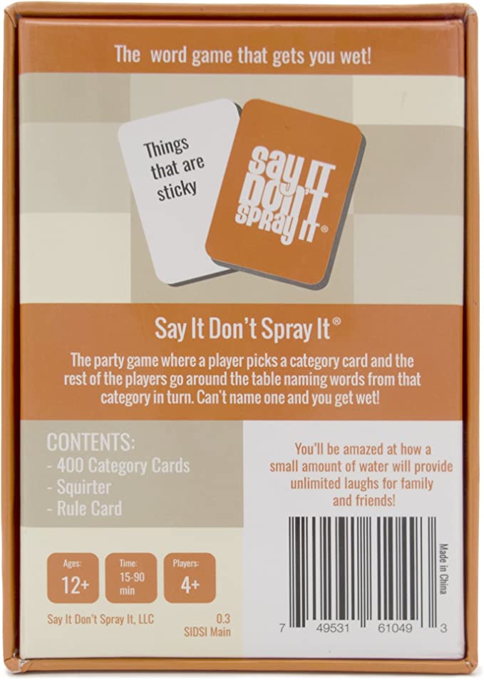 Say it Don’t Spray It is a party game where one judge picks a category card, thinks of a word in that category, and the rest of the players go around the table naming words from that category in turn. Can't name one and you get wet! The last person remaining (or the person who guesses the judge’s word) gets the card and becomes the judge.